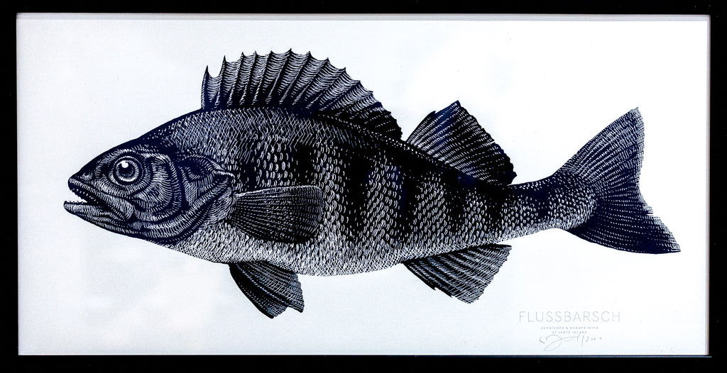 Dieses außergewöhnliche Kunstwerk zeigt einen Flussbarsch in einer eindrucksvoll detaillierten und kraftvollen Darstellung. Das Originalmotiv wurde von Janta Island in aufwendiger Kratztechnik gefertigt – einer seltenen, handwerklich anspruchsvollen Technik, bei der feinste Linien und Strukturen präzise aus der Oberfläche herausgearbeitet werden. Auf Basis dieses Originals entstanden hochwertige Drucke, die die Tiefe, Textur und Charakterstärke des Motivs originalgetreu bewahren.