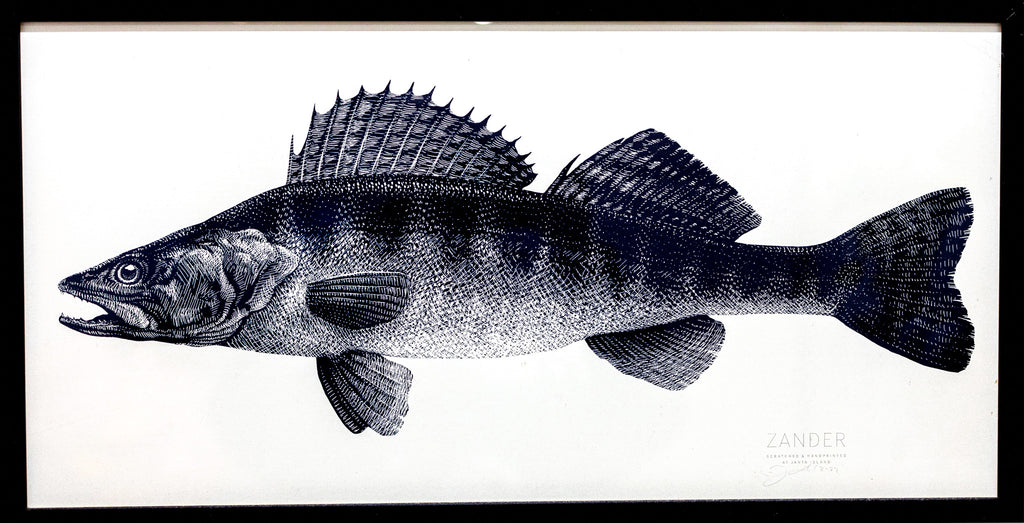 Dieses außergewöhnliche Kunstwerk zeigt einen Zander in beeindruckender Detailtiefe und zeitloser Eleganz. Das Originalmotiv wurde von Janta Island in aufwendiger Kratztechnik von Hand gefertigt – eine seltene und anspruchsvolle Technik, die jedem Detail Tiefe, Struktur und Charakter verleiht.